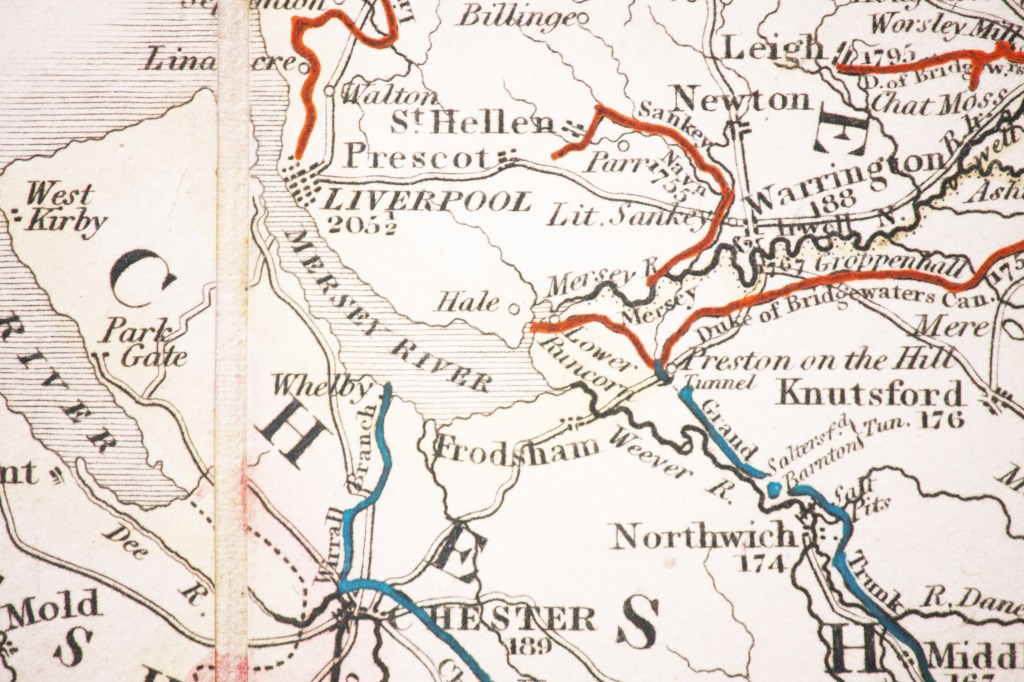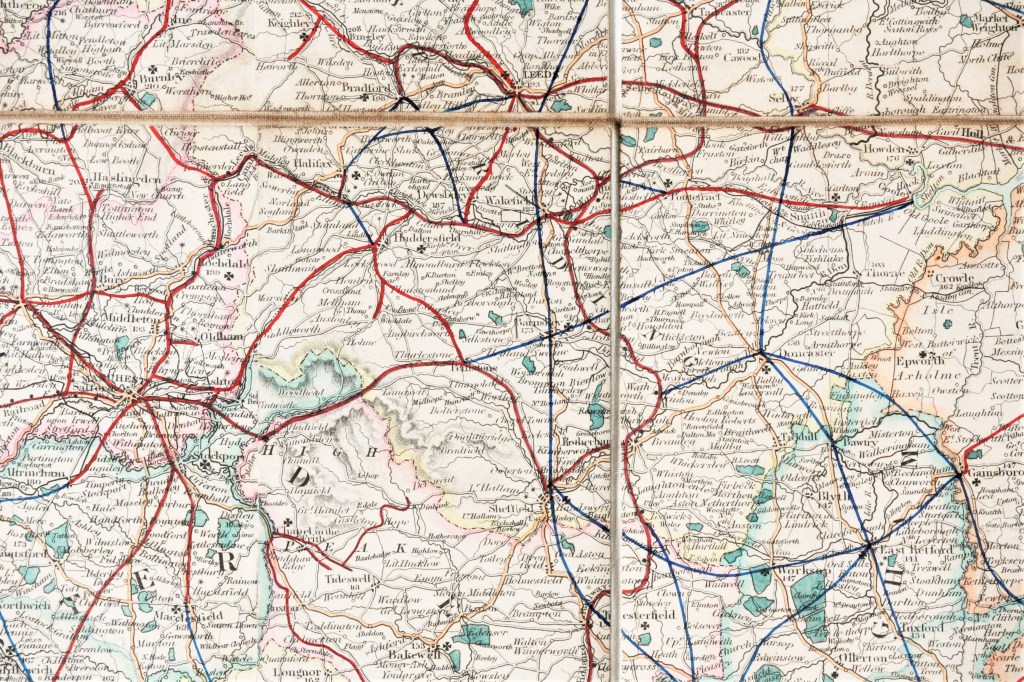 By 1845 railways and their relevance to travel, were dominating the purpose of those folding maps specifically generated for the traveller. Prior to this period, the network of roads criss-crossing the country were of key importance, along with the intersections where passengers on the coaches could change. Guides were sold that combined county maps with detailed tables of coach routes and their connections. The two key publishers were John Cary and Daniel Paterson and were the equivalent of the Bradshaw’s of the railway era. There was also a market for stand-alone folding or travelling maps. Many mapmakers were keen to include the canal network as an indication of their modernity and their ability connect the cities, along with other features like parks and indications of changes in landscape. As the maps evolved and updated, the density of information included, made the maps complex, with some mapmakers increasing their size to enable inclusion of the extra detail. Others placed emphasis on the packet ship routes which provided alternative means of travel, albeit not without risk.